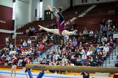 The Owls opened the meet on bars and got a team score of 45.525. Victoria Reggiani had the top score for Temple on the event with a 9.675, and Arone was right behind her with a 9.65.