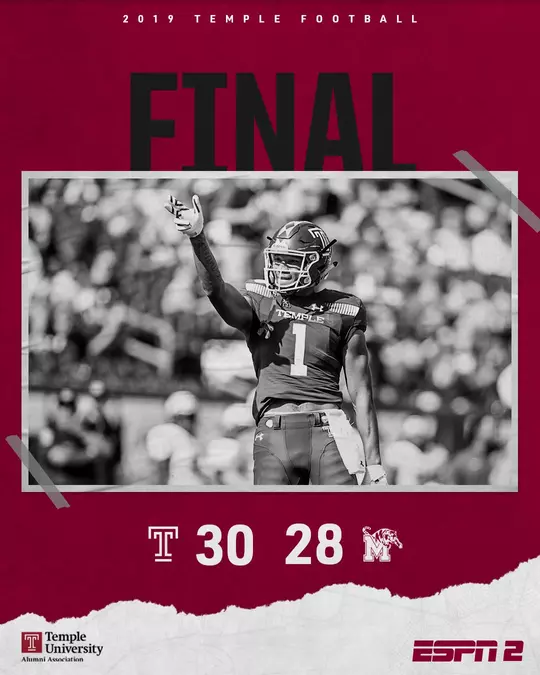 On the field, Temple used a big-play defense and a well-rounded offense to top #23 Memphis. It's the second time this season that the Owls took down a nationally ranked opponent. TU improves to 5-1, 2-0 in the American Athletic Conference!