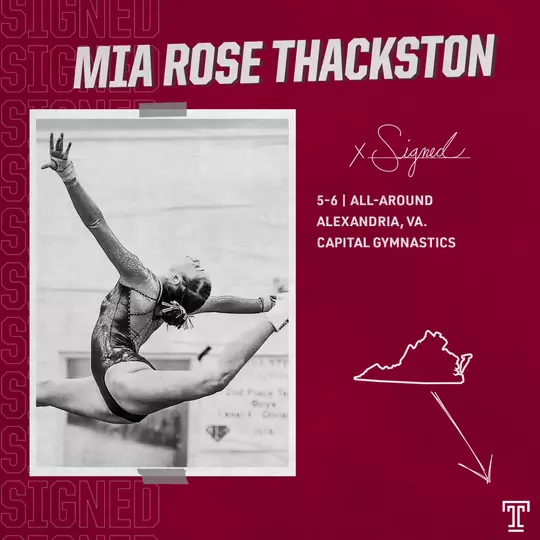 Thackston, a native of Alexandria, Va., attends Brookview Academy and trains at Capital Gymnastics. As a sophomore, she won the vault title at both the Region 7 Championships and the Virginia State Championships and her team took second at states. During her junior campaign, Thackston qualified for the both states and regionals and her team once again earned the runner-up spot at states. She is the President of Brookview Academy's Kappa Pho Chapter of Eta Sigma Alpha and is a member of the National Honor Society. Thackston plans on studying biology and chose Temple for the amazing team and coaching staff.